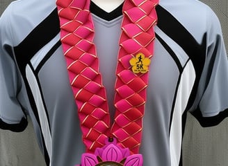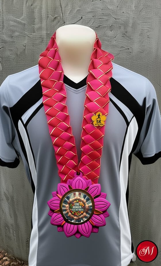 Our neck garland is a showcase of a decorated champion. The lanyard is hand-stitched, the enamel pin and rubber flower medal are both graphic designed and manufactured.